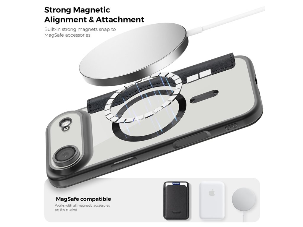 Kryt peněženky iPhone 17 Air umožňuje okamžité zarovnání s jakýmkoliv MagSafe příslušenstvím, bez sklouzávání a bez interferencí.