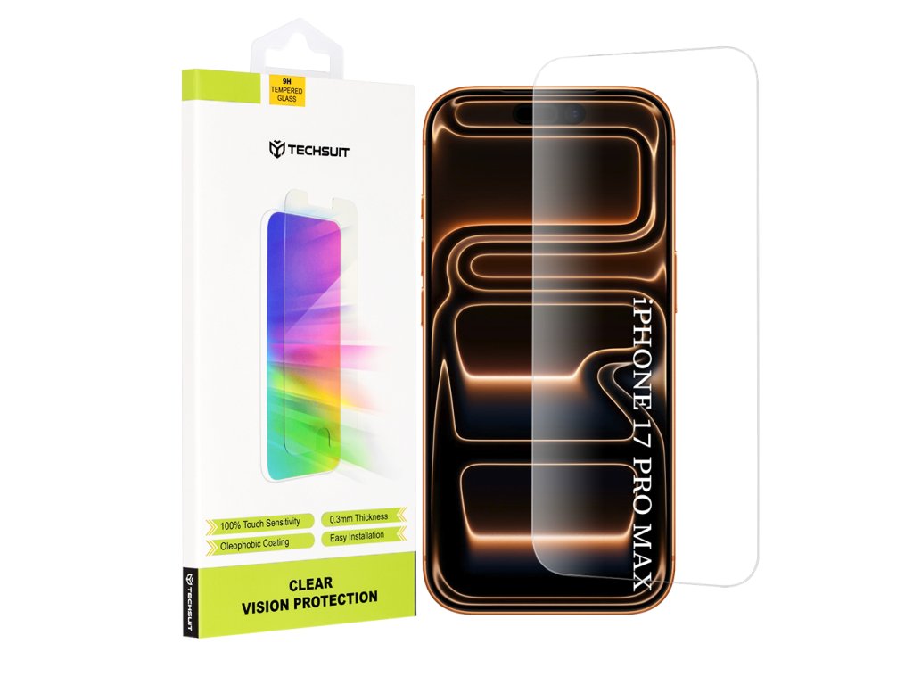 Skleněná fólie iPhone 17 Pro Max⭐originální Techsuit je nejlepší volbou pro ochranu displeje. Premium. 9H. Přátelská k pouzdru. Jen samé výhody!