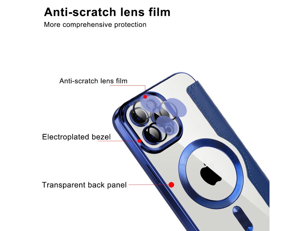 Zde je pouzdro pro iPhone 11 Pro Max vyrobené z ekologické kůže a TPU, které má průhledný povrch, přerušený lesklými akcenty.