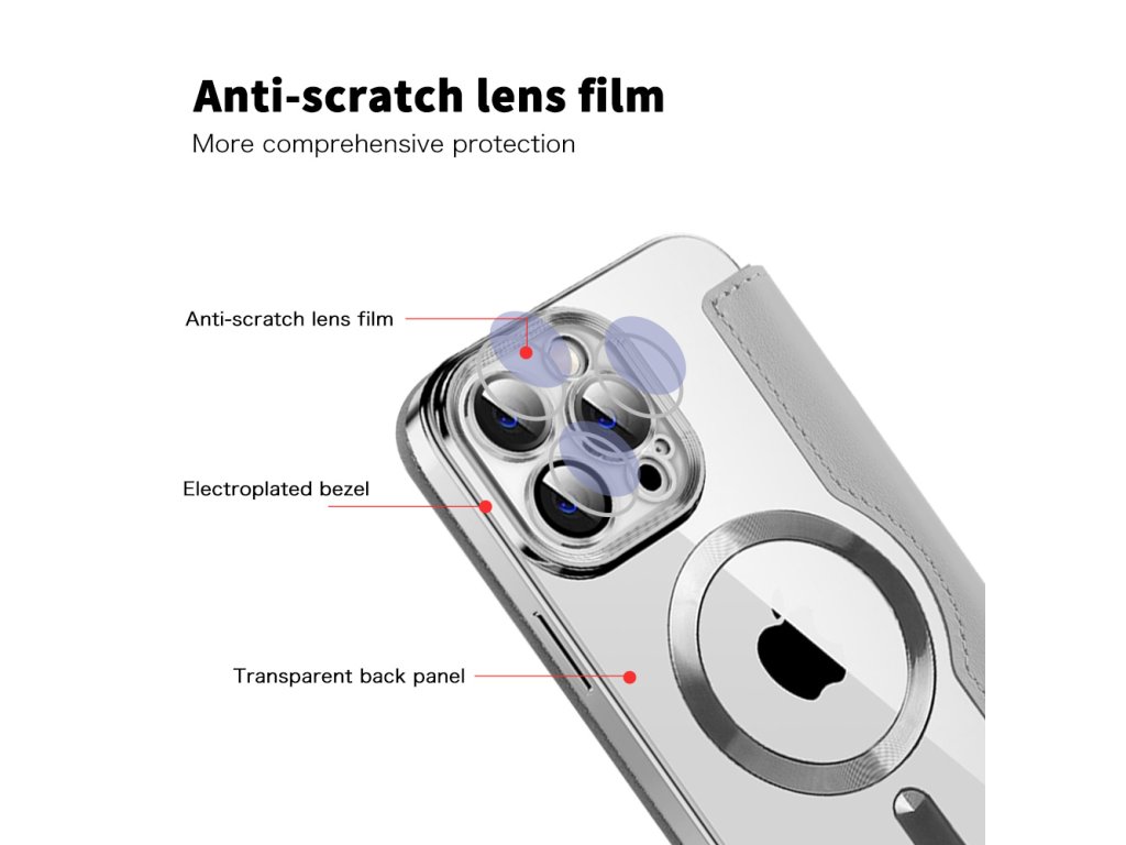 Toto je kryt pro iPhone 13 Pro Max z ekologické kůže a TPU, který má průhledný povrch přerušený lesklými akcenty.