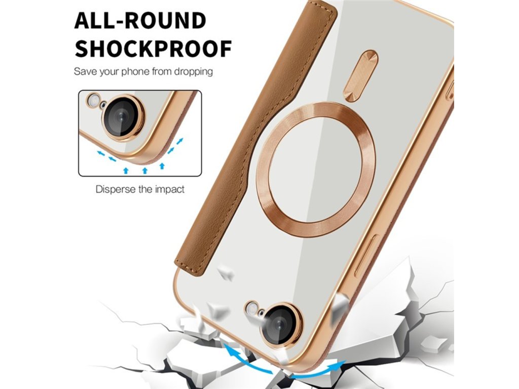 Jedná se o obal pro iPhone 16e z ekologické kůže a TPU s průhledným povrchem zahrnutým lesklými akcenty.