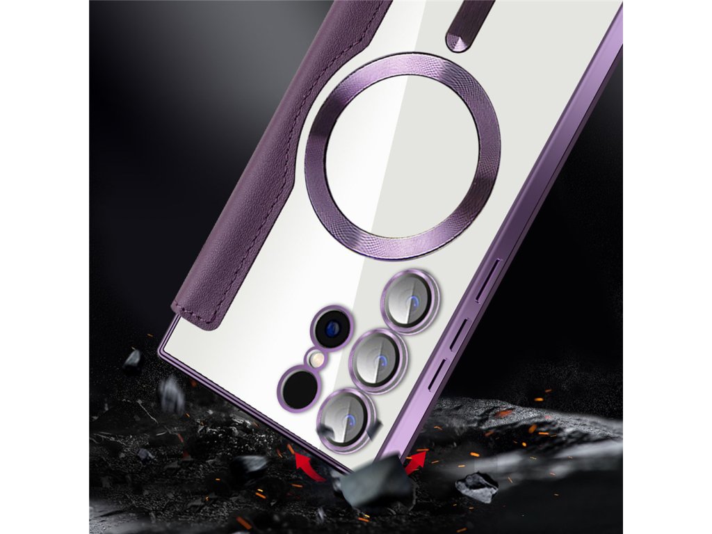 Zde je pouzdro pro Samsung Galaxy S24 Ultra z ekologické kůže a TPU, které má průhledný povrch přerušený lesklými akcenty.