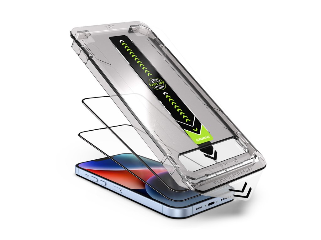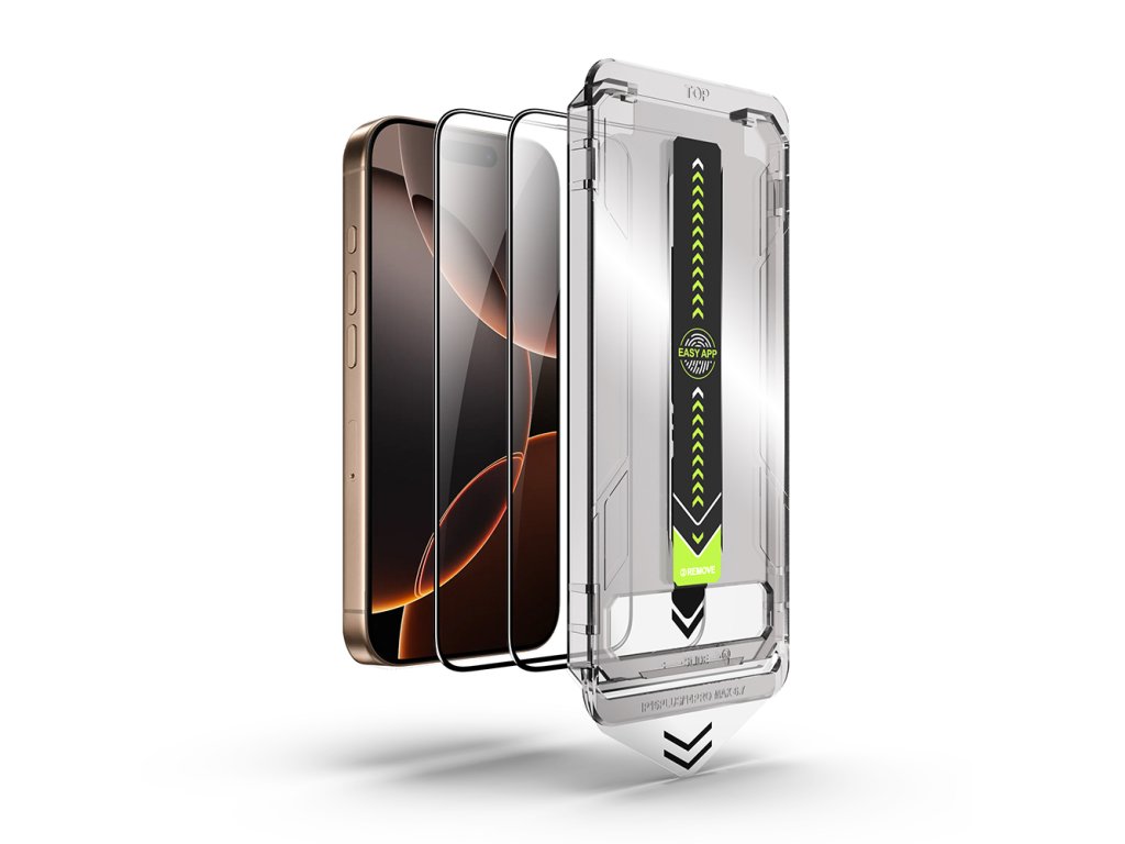 Kalibrovaný polymerový rám je navržen milimetrově přesně pro iPhone 16 Pro, umožňuje automatické zarovnání folie na obrazovce bez nutnosti předchozích zkušeností.