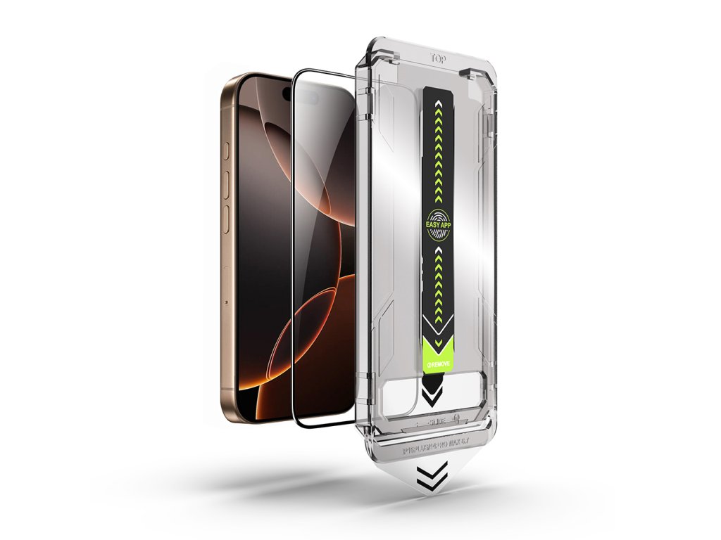 Kalibrovaný polymerový rám je milimetrově navržen pro iPhone 16 Pro Max, umožňuje automatické vyrovnání fólie na obrazovce, bez potřeby předchozích zkušeností.
