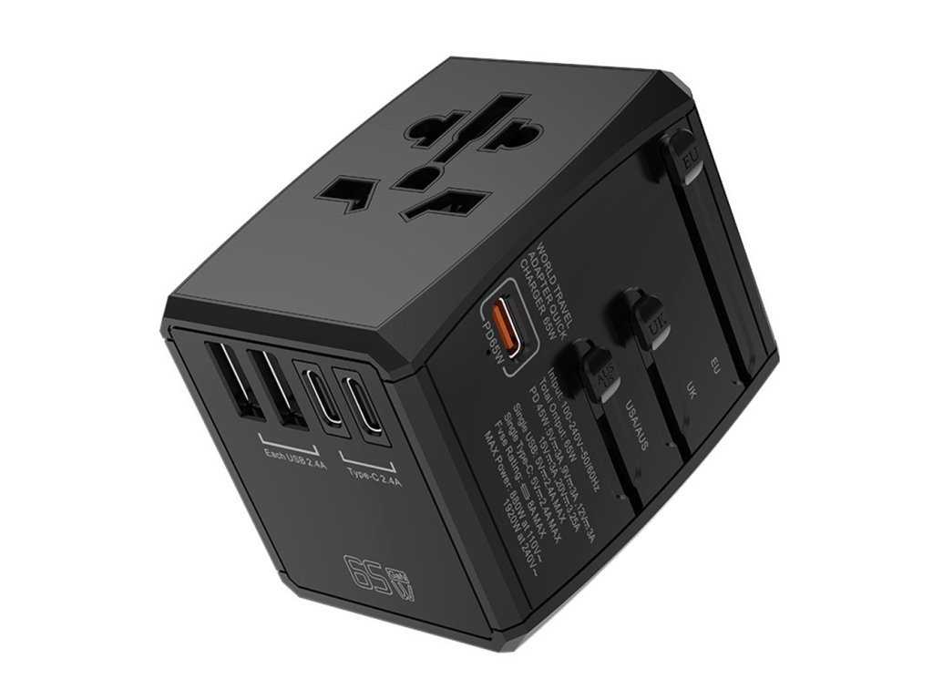 Techsuit - Travel Adapter cestovní adaptér s PD 65 W, 2× USB, 3× USB-C, EU/UK/AUS/US – černý