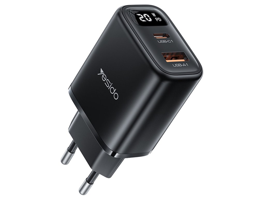 Yesido – Wall Charger síťová nabíječka s digitálním displejem USB + USB-C 20W – černá